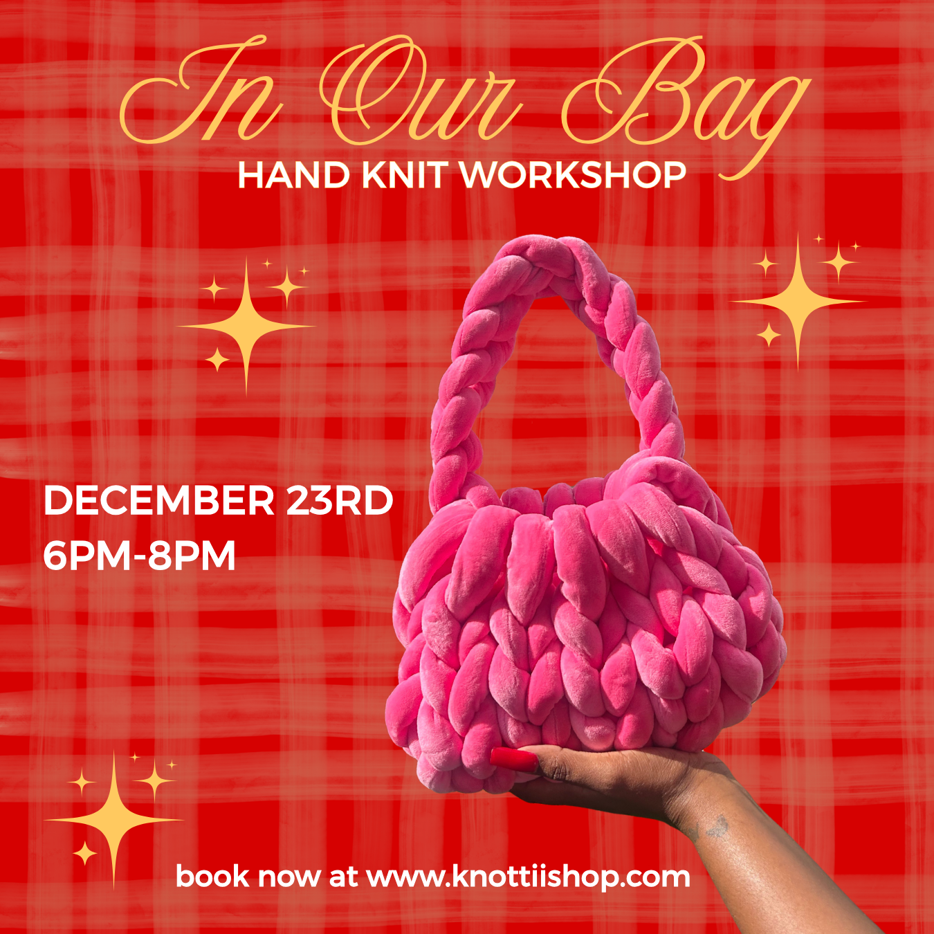 Join us on December 23rd for In Our Bag: A Knottii Workshop hosted at Habibi Bazaar. Where we'll learn how to hand knit your very own purse from start to finish - no experience needed!